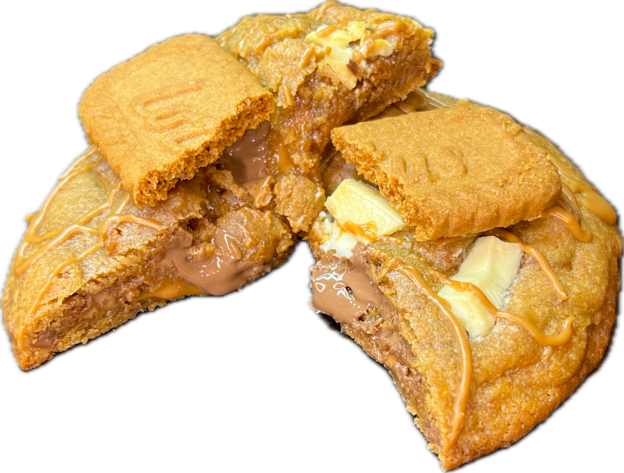 Biscoff Cookie er deilige, gyldne cookies med en karamellisert smak, fylt med kremet Biscoff-krem og toppet med knasende Biscoff-biter for en uforglemmelig smakskombinasjon.